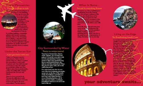 These brochures are meant to draw people to visit interesting places and help them plan an itinerary. A good travel brochure has to be well-composed, inviting, and ultimately, easy to navigate.